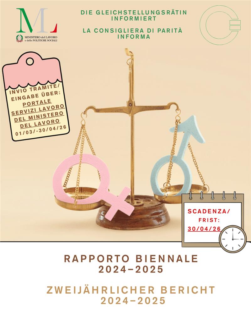 Die Gleichstellungsrätin informiert, dass ab 1. März 2026 auf dem Portal des Ministeriums für Arbeit und Sozialpolitik Servizi Lavoro das elektronische Formular für die Übermittlung des Berichts über die Situation des männlichen und weiblichen Personals für das Biennium 2024/2025 unter folgendem Link verfügbar ist: https://servizi.lavoro.gov.it